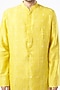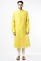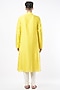 Featuring a bright yellow kurta in chanderi base with gold lace and hand-crafted flat cords embroidery. It is paired with contrasting off-white cotton silk churidar pants.
