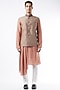 Featuring a brown bundi jacket in linen base with ajrakh print. This contains only one piece.