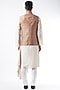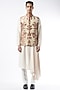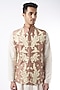 Featuring a katha bundi jacket in pure raw silk base with off-white resham embroidery. This contains only one piece.