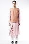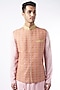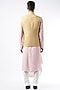 Featuring a beige bundi jacket in raw silk base with resham embroidery. It is paired with a contrasting cotton silk kurta and pants.