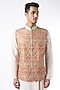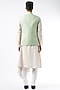 Featuring a mint green bundi jacket in raw silk base with resham embroidery. It is paired with a contrasting cotton silk kurta and pants.