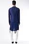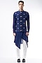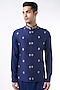 Featuring a navy blue bundi jacket in raw silk base with hand embroidery. It is paired with a matching cotton silk kurta and pants.