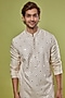 Featuring a pink kurta in silk chanderi base with jaal embroidery. It is paired with contrasting pants.