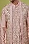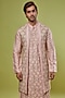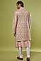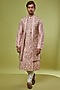 Featuring a pink long jacket in tussar silk base with tonal jaal embroidery. It is paired with a matching kurta and pants.