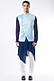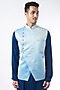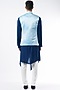Featuring a powder blue asymmetrical bundi jacket in pure linen silk base with zardosi resham hand work. This contains only one piece.