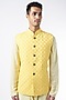 Featuring a yellow bundi jacket in raw silk base with dual tone hand weaving. It is paired with a matching cotton silk draped kurta and white churidar pants.