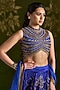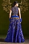 Featuring a royal blue lehenga in silk base with floral embroidery. It is paired with a handmade tussar embroidered blouse and an organza dupatta. Accentuate it with kundan polki jewellery, embellished heels and a potli bag for a complete look, perfect wear for a wedding, sangeet or engagement ceremony.