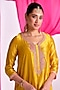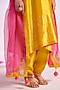 Featuring a yellow kurta in silk base with gota, thread and aari work. It is paired with pants and an organza dupatta. Accentuate it with statement earrings and heels for a festive occasion, haldi, wedding or engagement ceremony.