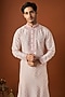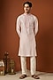 Featuring a baby pink kurta in tussar base with hand block print and hand embroidery. Style it with pants and mojaris for a festive occasion, cultural event, wedding, sangeet or engagement ceremony.