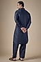 Featuring a navy blue pathani kurta in art silk base. It is paired with salwar pants. Style it with kolhapuri sandals for a festive occasion, cultural event, pooja or sangeet ceremony.