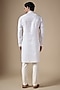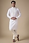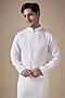 Featuring a white handcrafted kurta in art silk base with machine and hand embroidery. It is paired with pants. Style it with kolhapuri sandals for a festive occasion, cultural event, pooja or wedding ceremony.