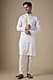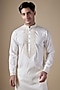 Featuring a white handcrafted kurta in art silk base with machine and hand embroidery. It is paired with pants. Style it with kolhapuri sandals for a festive occasion, cultural event, pooja or wedding ceremony.
