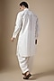 Featuring a white pathani kurta in art silk base. It is paired with salwar pants. Style it with kolhapuri sandals for a festive occasion, cultural event, pooja or sangeet ceremony.