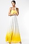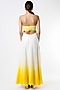 Featuring a yellow and white backless gown in satin base with tie-dye print and pearl embroidery.