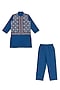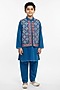 Featuring a blue bundi jacket for boys in a glace cotton base with mirror work and embroidery. It is paired with a kurta and pants. Style it with a watch and pair of shoes for a festive occasion or reception ceremony.
