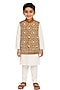 Featuring a mustard yellow bundi jacket for boys in a glace cotton base with leather work. It is paired with a kurta and pants. Style it with a watch and pair of shoes for a festive occasion or reception ceremony.