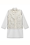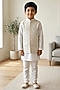 Featuring a white bundi jacket for boys in cotton silk base with patra and floral motif embroidery. It is paired with a kurta and pants. Style it with a watch and a classic pair of loafers or juttis for a festive occasion, wedding or pooja ceremony.