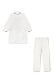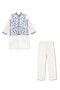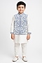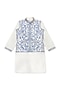 Featuring a white bundi jacket for boys in a glace cotton base with mirror embroidery. It is paired with a kurta and pants. Style it with a watch and pair of shoes for a festive occasion or reception ceremony.