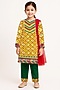 Featuring a yellow kurta for girls in silk base with embroidery and print. It is paired with pants and a dupatta. Style it with cute hair accessories and sandals for wedding ceremonies or any festive occasion.