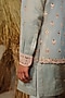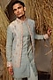 Featuring an ice blue nehru jacket in silk tissue and silk wool blend base with gota-patti and glass beads embroidery. It is paired with a kurta and pants. Style it with kolhapuri sandals for a festive occasion, cultural event, wedding or engagement ceremony.