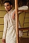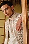 Featuring an ivory nehru jacket in raw silk and chanderi base with gota-patti and glass beads embroidery. It is paired with a kurta and pants. Style it with kolhapuri sandals for a festive occasion, cultural event, wedding or engagement ceremony.