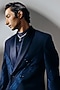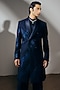 Featuring a navy blue trench coat in silk wool blend base with pintucks detail and gota embroidery. It is paired with an embroidered satin shirt and pants. Style it with a pair of loafers for a wedding for engagement ceremony.