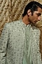 Featuring a pistachio green bandhgala jacket in silk wool blend base with thread and matte sequins hand embroidery. It is paired with a chanderi embroidered kurta and flared pants. Accentuate it with classic black or polished leather mojaris and a sleek wrist watch for a refined finish, making it ideal for wedding receptions, cocktail evenings or formal social gatherings.