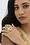 Featuring a 22kt gold plated ring studded with faux pearls, semi-precious stones and mirror work, set in brass alloy. Perfect choice for weddings or other Indian festivities.