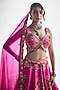 Featuring a fuchsia pink lehenga in dupion silk and organza base with floral hand and machine embroidery. It is paired with an embroidered blouse and a dupatta. Accentuate with statement jewellery and heels for wedding ceremony.