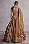 Featuring a orange and green lehenga in raw silk and organza base with floral hand and machine embroidery. It is paired with an embroidered blouse and a dupatta. Accentuate with statement jewellery and heels for wedding ceremony.