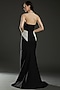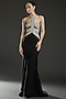 Featuring a black and ivory halter dress in chiffon base with metallic details.