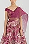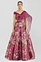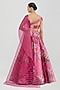 Featuring a bloom pink lehenga in metallic stripe base. It is paired with a blouse and a drape. Accentuate the designer lehenga with swarovski or zircon jewellery, embellished heels and a clutch for a bridal look, Perfect wear for your sangeet or cocktail ceremony.