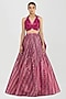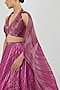 Featuring a bloom pink lehenga in organza and sheer stripe fabric base. It is paired with a blouse and a dupatta. Accentuate the designer lehenga with swarovski or zircon jewellery, embellished heels and a clutch for a bridal look, Perfect wear for your sangeet or cocktail ceremony.