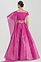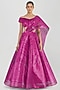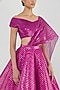 Featuring a bloom pink lehenga in tulle and striped base. It is paired with a blouse and a winged drape. Accentuate it with zirconia or swarovski jewellery, block heels and a clutch for a sangeet or cocktail ceremony.