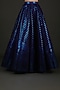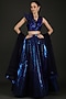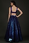 Featuring a blue lehenga in polymer base with stripe. It is paired with a matching blouse and a lace dupatta.