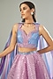 Featuring a blue and purple ombre metallic ombre lehenga in chiffon, polymer, and striped fabric base. It is paired with a matching hand-embroidered blouse and a drape having metal piping detail.