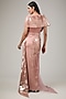 Featuring a blush pink gown in metallic polymer and organza base. Accentuate it with statement earrings and heels for a reception ceremony or cocktail party.