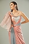 Featuring a blush pink and mint moulded draped gown in metallic polymer and chiffon base.