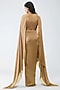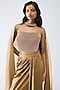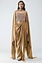Featuring a bronze cape in satin chiffon base. It is paired with a crystal moulded bustier and a skirt. Accentuate it with silver jewellery, heels and a clutch for evening wear or cocktail party.