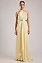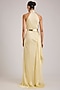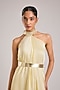 Featuring a butter yellow maxi dress in satin chiffon base with a halter neckline and micro pleats detail. It is paired with a belt. Accentuate it with statement earrings and block heels for evening wear or cocktail parties.