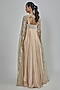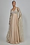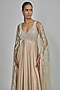 Featuring a champagne gown in chiffon and butterfly net base with crystalvein detailing. It is paired with a drape. Accentuate it with zircon dangler earrings, a clutch and metallic heels for a cocktail, sangeet or evening soirees.
