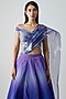 Featuring a cosmos blue ombre skirt in butterfly net, polyester and nylon base. It is paired with metallic off-shoulder top and a metallic sunray drape. Accentuate it with zircon or diamond jewellery, a clutch and block heels for a destination wedding, sangeet or engagement ceremonies.