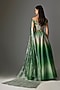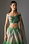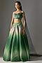 Featuring an emerald green off-shoulder top in butterfly net base with a metallic glitch handwoven textile details. It is paired with a flued tulle ombre skirt and a metallic tulle sunray glitch drape. Accentuate it with zircon dangler earrings, a clutch and metallic heels for a cocktail, sangeet or evening soirees.