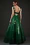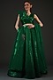 Featuring an emerald green striped lehenga in polymer base. It is paired with a matching blouse and a lace dupatta.