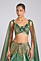 Featuring an emerald metallic top in organza and butterfly net base with glass beads. It is paired with a lehenga and a metallic ruffled two drape. Accentuate it with dangler earrings and heels for a cocktail, reception, sangeet or engagement ceremony.