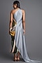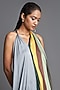 Featuring an emerald sunray asymmetrical draped dress in chiffon base with metal pipe detailing.