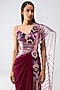 Featuring a garnet-colored draped gown saree in organza and chiffon base with glass beads embroidery and chiffon palla. Accentuate it with zircon earrings and stilettos for evening wear or cocktail parties.