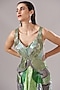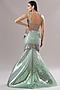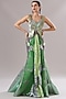 Featuring a green draped gown in metallic polymer base with hand embroidery.