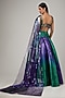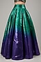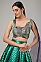 Featuring a green and purple lehenga in metallic polymer base. It is paired with a blouse and drape. Accentuate it with statement jewellery and heels for a wedding or engagement ceremony