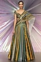 Featuring a green plisse lehenga in striped fabric and chevron fabric base. It is paired with a matching hand-embroidered metallic blouse and a structured drape.